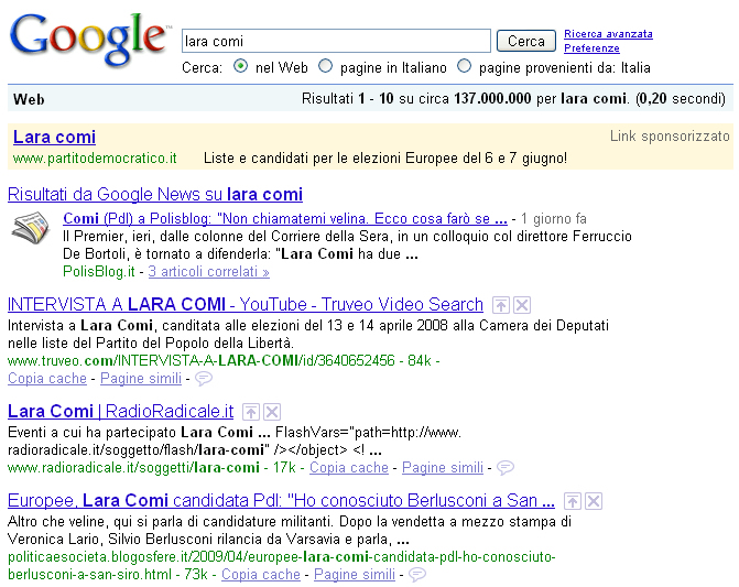 Se digiti in Google il nome dei nostri candidati alle elezioni europee (io ho provato con Lara Comi, La Russa, Paniz, Gardini, Aprea, ecc.) appare un link sponsorizzato che porta alla pagina del sito nazionale del partito democratico, alla lista dei loro candidati e ad altre informazioni sulla…