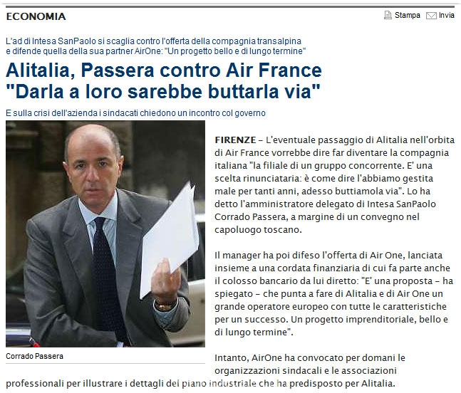 Alitalia, Passera contro Air France “Airone progetto a lungo termine”