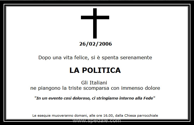 Povera politica.. in questo nuovo sistema politico dove l’ apparire in TV ( a qualsiasi titolo ) conta più della sostanza, non poteva che morire!
