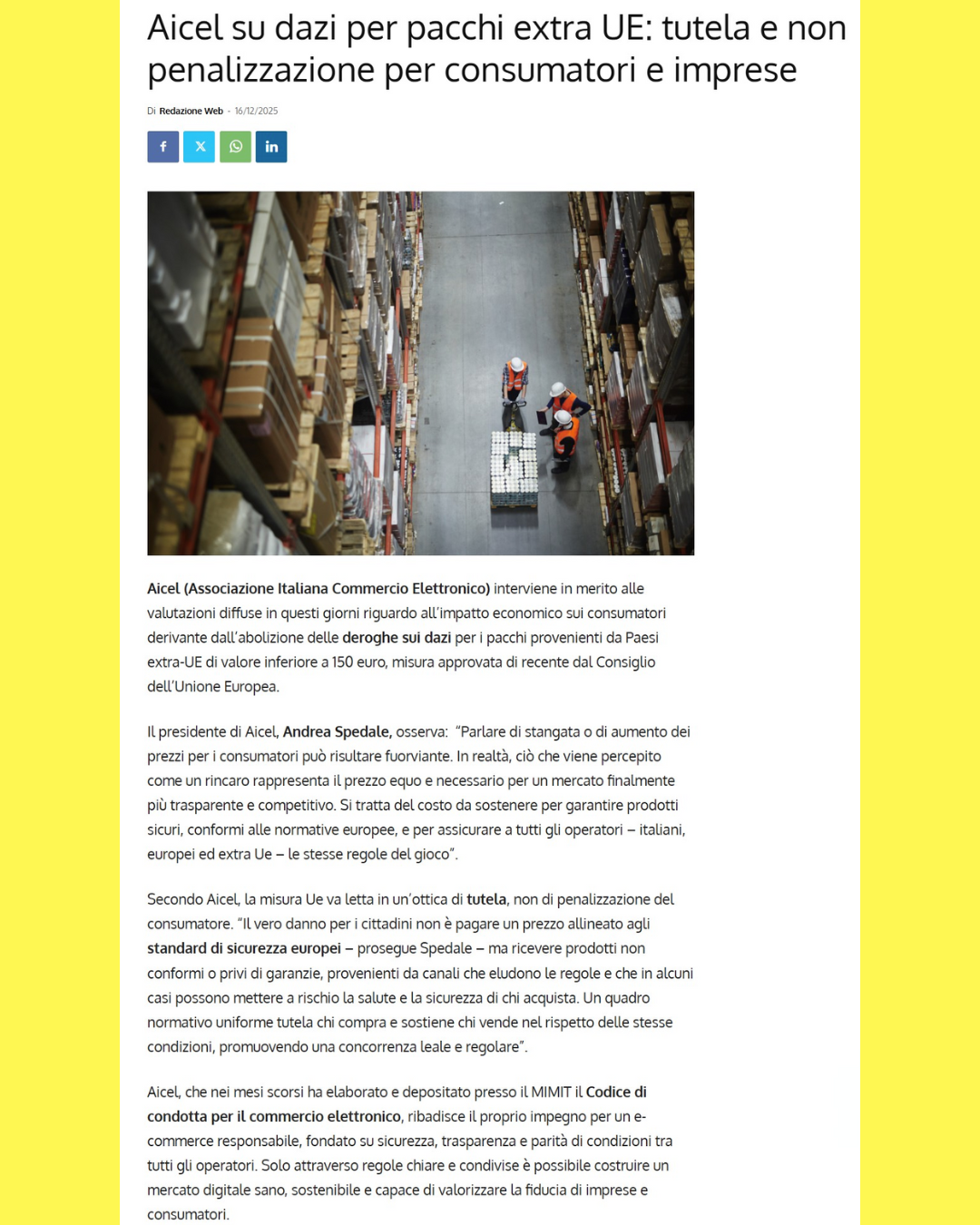 Il presidente di Aicel, Andrea Spedale, osserva: “Parlare di stangata o di aumento dei prezzi per i consumatori può risultare fuorviante. In realtà, ciò che viene percepito come un rincaro rappresenta il prezzo equo e necessario per un mercato finalmente più trasparente e competitivo. Si tratta del costo da sostenere per garantire prodotti sicuri, conformi alle normative europee, e per assicurare a tutti gli operatori – italiani, europei ed extra Ue – le stesse regole del gioco”.