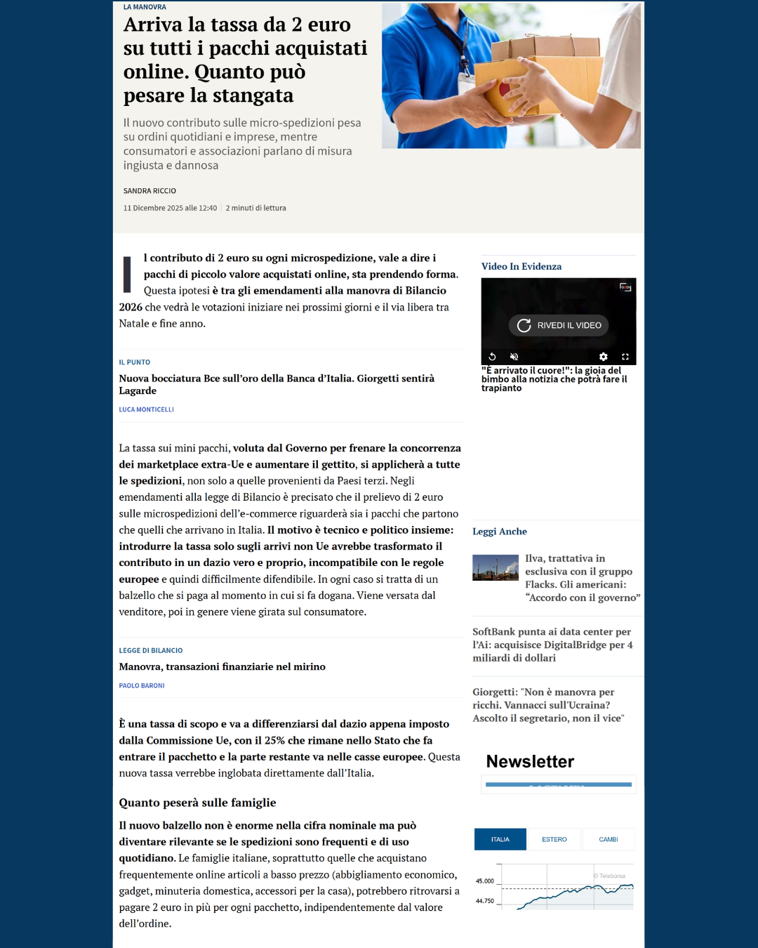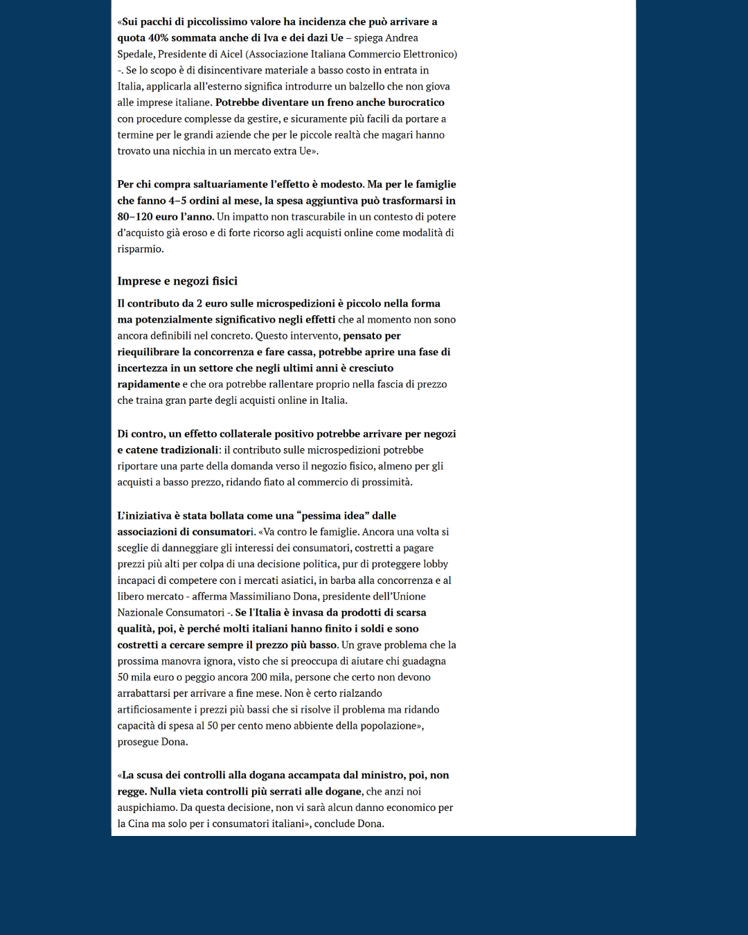 Sui pacchi di piccolissimo valore ha incidenza che può arrivare a quota 40% sommata anche di Iva e dei dazi Ue – spiega Andrea Spedale, Presidente di Aicel (Associazione Italiana Commercio Elettronico) -. Se lo scopo è di disincentivare materiale a basso costo in entrata in Italia, applicarla all’esterno significa introdurre un balzello che non giova alle imprese italiane. Potrebbe diventare un freno anche burocratico con procedure complesse da gestire, e sicuramente più facili da portare a termine per le grandi aziende che per le piccole realtà che magari hanno trovato una nicchia in un mercato extra Ue