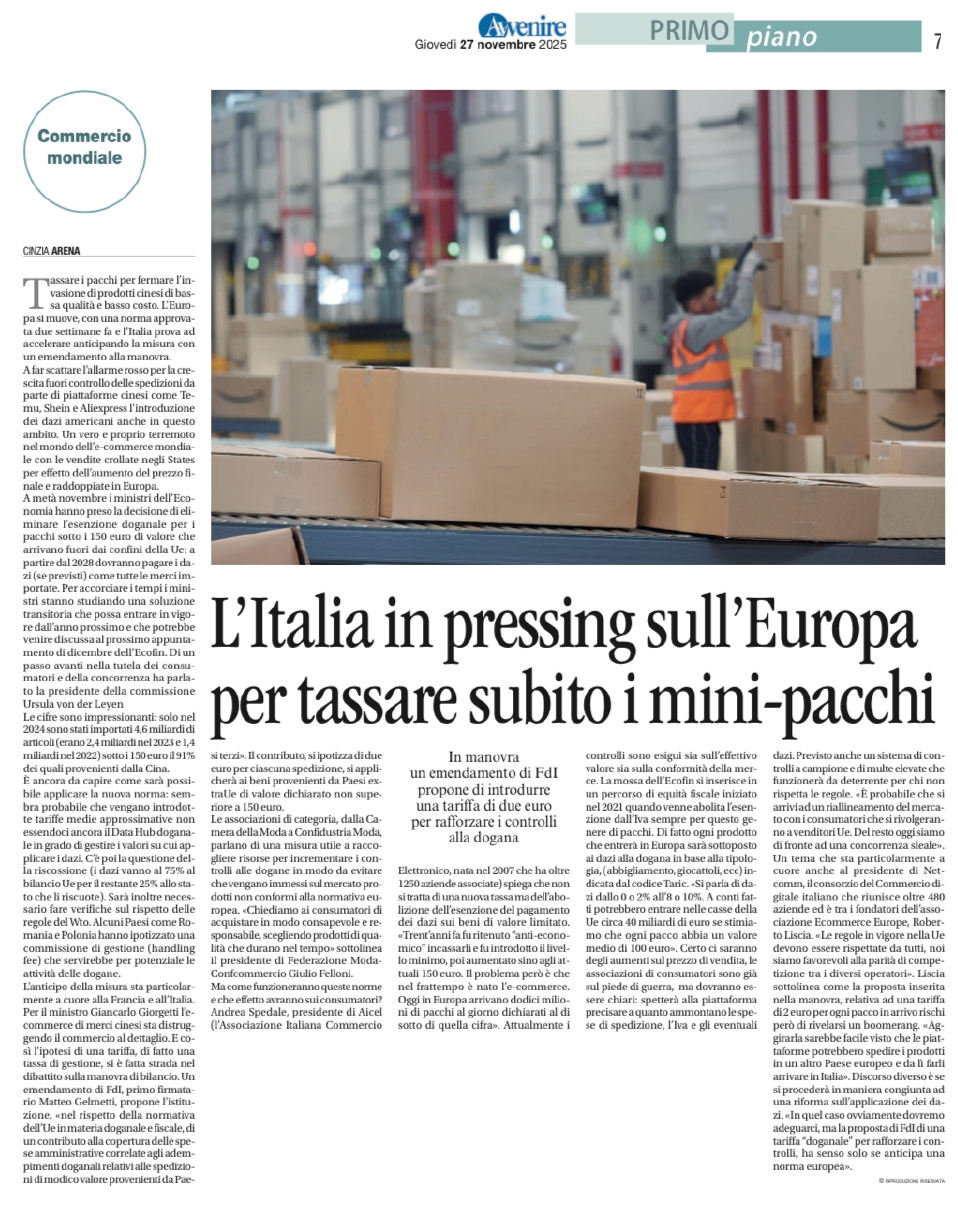 Ma come funzioneranno queste norme e che effetto avranno sui consumatori? Andrea Spedale, presidente di Aicel (l’Associazione Italiana Commercio Elettronico, nata nel 2007 che ha oltre 1250 aziende associate) spiega che non si tratta di una nuova tassa ma dell’abolizione dell’esenzione del pagamento dei dazi sui beni di valore limitato. «Trent’anni fa fu ritenuto “anti-economico” incassarli e fu introdotto il livello minimo, poi aumentato sino agli attuali 150 euro. Il problema però è che nel frattempo è nato l’e-commerce. Oggi in Europa arrivano dodici milioni di pacchi al giorno dichiarati al di sotto di quella cifra». Attualmente i controlli sono esigui sia sull’effettivo valore sia sulla conformità della merce. La mossa dell’Ecofin si inserisce in un percorso di equità fiscale iniziato nel 2021 quando venne abolita l’esenzione dall’Iva sempre per questo genere di pacchi. Di fatto ogni prodotto che entrerà in Europa sarà sottoposto ai dazi alla dogana in base alla tipologia, (abbigliamento, giocattoli, ecc) indicata dal codice Taric. «Si parla di dazi dallo 0 o 2% all’8 o 10%. A conti fatti potrebbero entrare nelle casse della Ue circa 40 miliardi di euro se stimiamo che ogni pacco abbia un valore medio di 100 euro». Certo ci saranno degli aumenti sul prezzo di vendita, le associazioni di consumatori sono già sul piede di guerra, ma dovranno essere chiari: spetterà alla piattaforma precisare a quanto ammontano le spese di spedizione, l’Iva e gli eventuali dazi. Previsto anche un sistema di controlli a campione e di multe elevate che funzionerà da deterrente per chi non rispetta le regole. «È probabiIe che si arrivi ad un riallineamento del mercato con i consumatori che si rivolgeranno a venditori Ue. Del resto oggi siamo di fronte ad una concorrenza sleale».