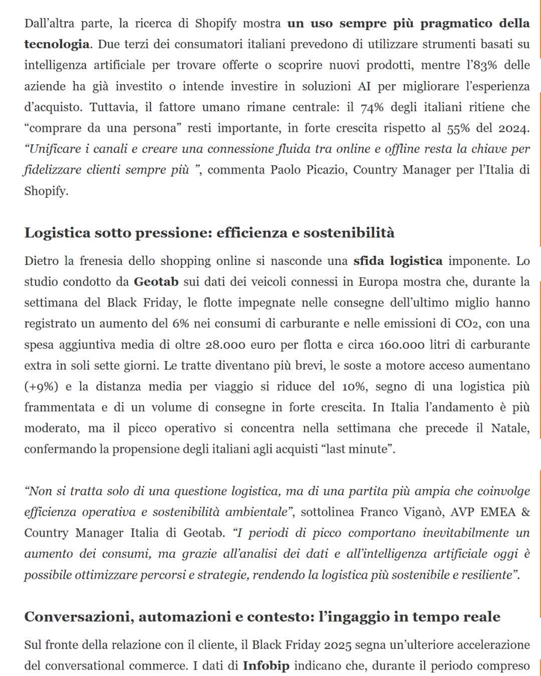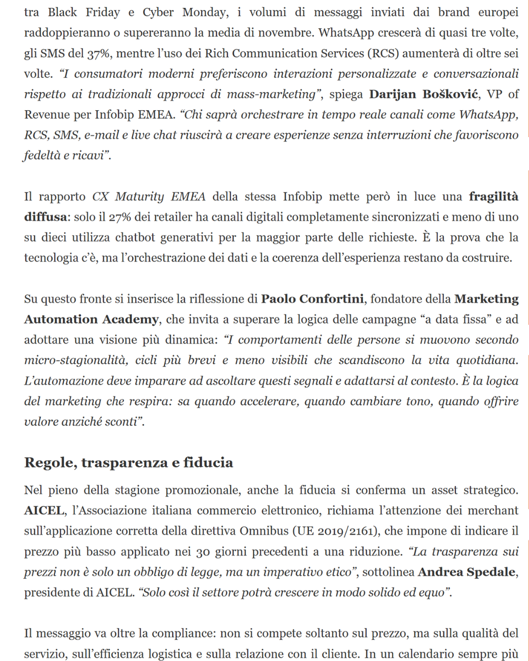 Nel pieno della stagione promozionale, anche la fiducia si conferma un asset strategico. AICEL, l’Associazione italiana commercio elettronico, richiama l’attenzione dei merchant sull’applicazione corretta della direttiva Omnibus (UE 2019/2161), che impone di indicare il prezzo più basso applicato nei 30 giorni precedenti a una riduzione. “La trasparenza sui prezzi non è solo un obbligo di legge, ma un imperativo etico”, sottolinea Andrea Spedale, presidente di AICEL. “Solo così il settore potrà crescere in modo solido ed equo”.