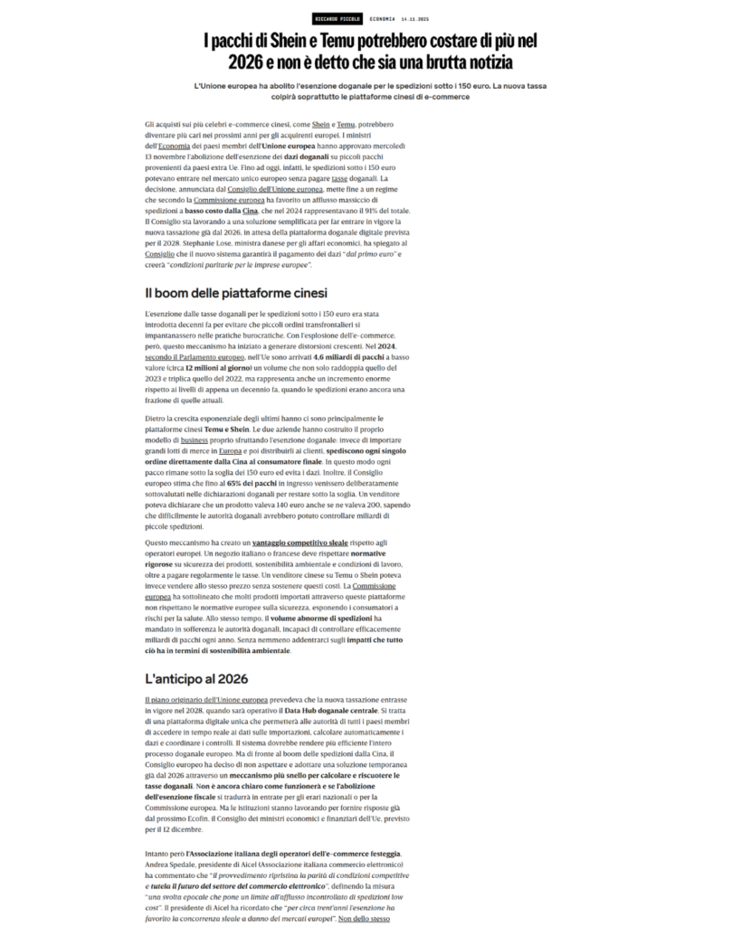 Intanto però l’Associazione italiana degli operatori dell’e-commerce festeggia. Andrea Spedale, presidente di Aicel (Associazione italiana commercio elettronico) ha commentato che “il provvedimento ripristina la parità di condizioni competitive e tutela il futuro del settore del commercio elettronico”, definendo la misura “una svolta epocale che pone un limite all’afflusso incontrollato di spedizioni low cost”. Il presidente di Aicel ha ricordato che “per circa trent’anni l’esenzione ha favorito la concorrenza sleale a danno dei mercati europei”.